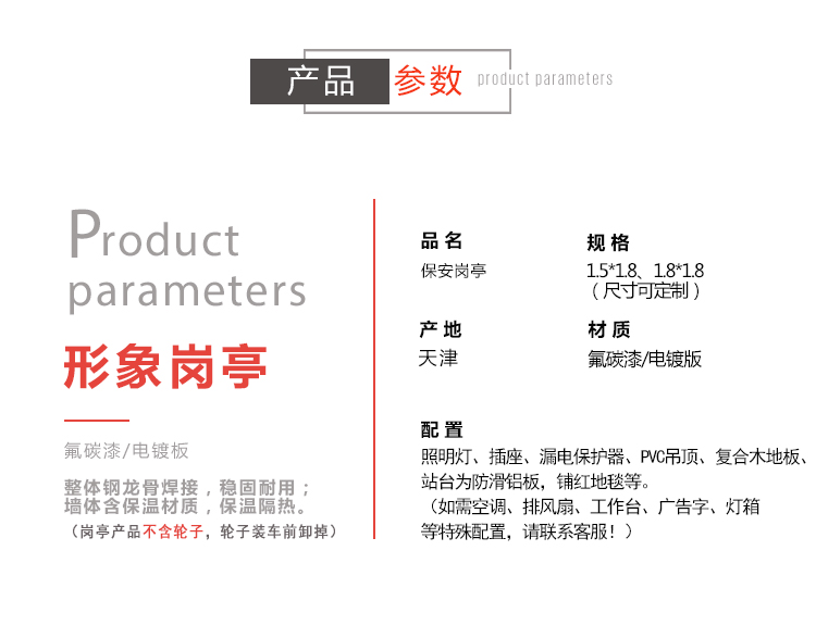 標準配置:形象崗?fù)?/a>墻體含保溫材料,屋頂鍍鋅板靜電噴涂,PVC吊頂,室內(nèi)地板復(fù)合木地板;加配裝置:工作臺,抽屜,鍵盤,開關(guān)插座,暗敷線路(如需加裝空調(diào),請咨詢15822882616)。